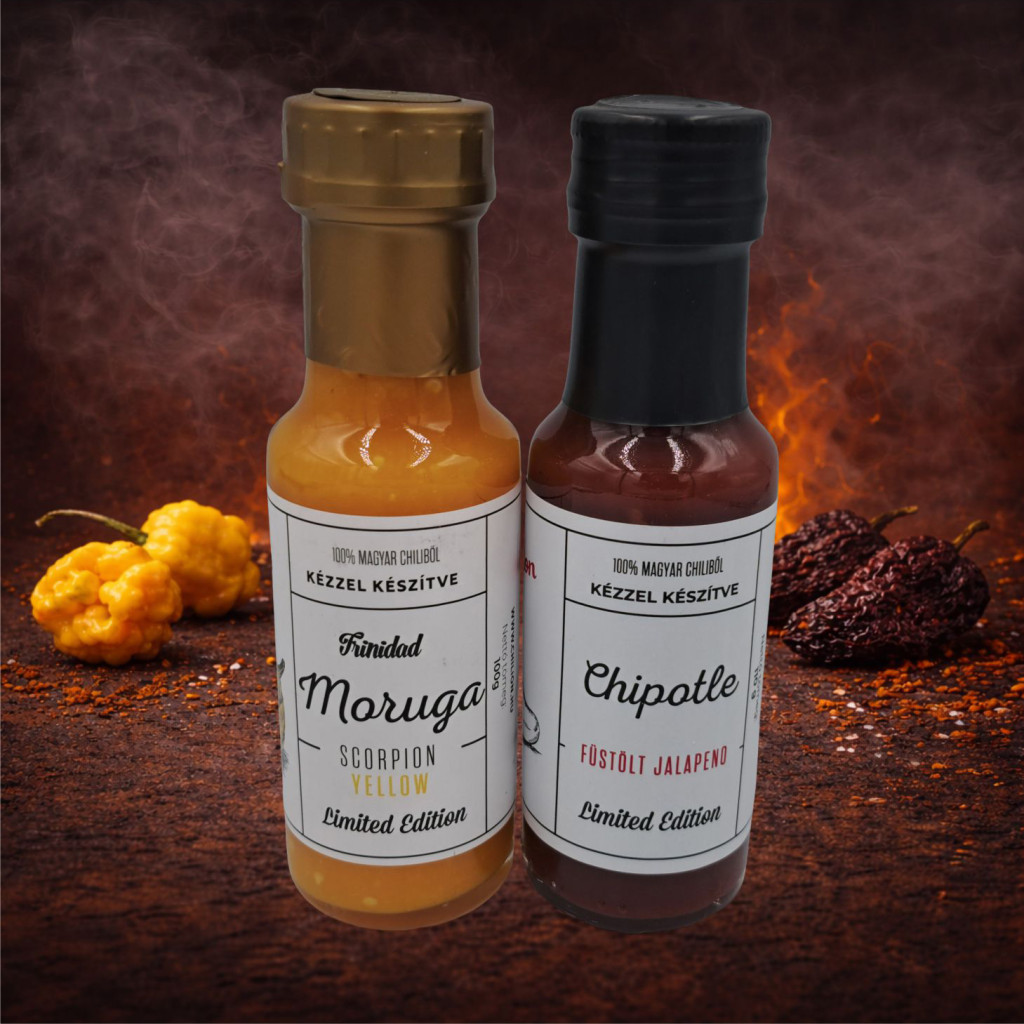 A Füstös Skorpiócsípés duó a chili világának két arcát mutatja meg: a füstös, paradicsomos középút és az extrém skorpió-erő találkozását egyetlen csomagban.