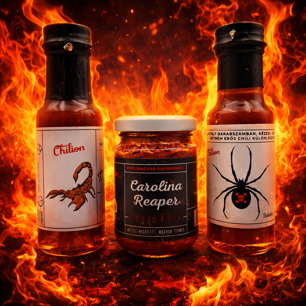 A csomag része a Fekete Özvegy – Carolina Reaper chili szósz, amely világrekorder erősségű Carolina Reaper paprikából készül. Kizárólag CR paprikát tartalmaz, színezék, sűrítő és mesterséges adalékanyag nélkül. Minden üvegben a Reaperre jellemző intenzív íz és illat dominál. Gombostűnyi mennyiség is hosszan tartó csípős érzetet, izzadást és erőteljes kapszaicin-reakciót idézhet elő.