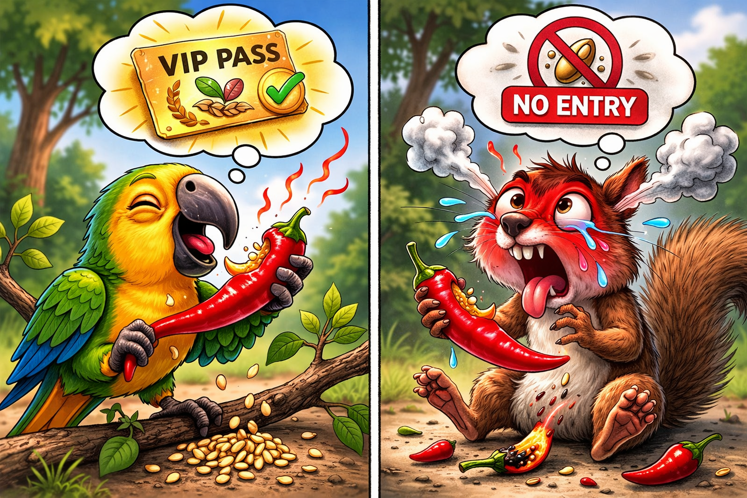 A kapszaicin nem véletlenül alakult ki a paprikában – evolúciós fegyver, amelyet a növény az emlősök ellen fejlesztett ki. Jordt és Julius 2002-es, a Cell folyóiratban publikált kutatása (PubMed) kimutatta, hogy a madarak TRPV1 receptora érzéketlen a kapszaicinre. A háttérben egyetlen aminosav-különbség. Az emlősök szétrágnák a magvakat, elpusztítva a következő generációt, míg a madarak egészben nyelik le és a bélrendszerükön áthaladva, a székletükkel terjesztik a magokat.