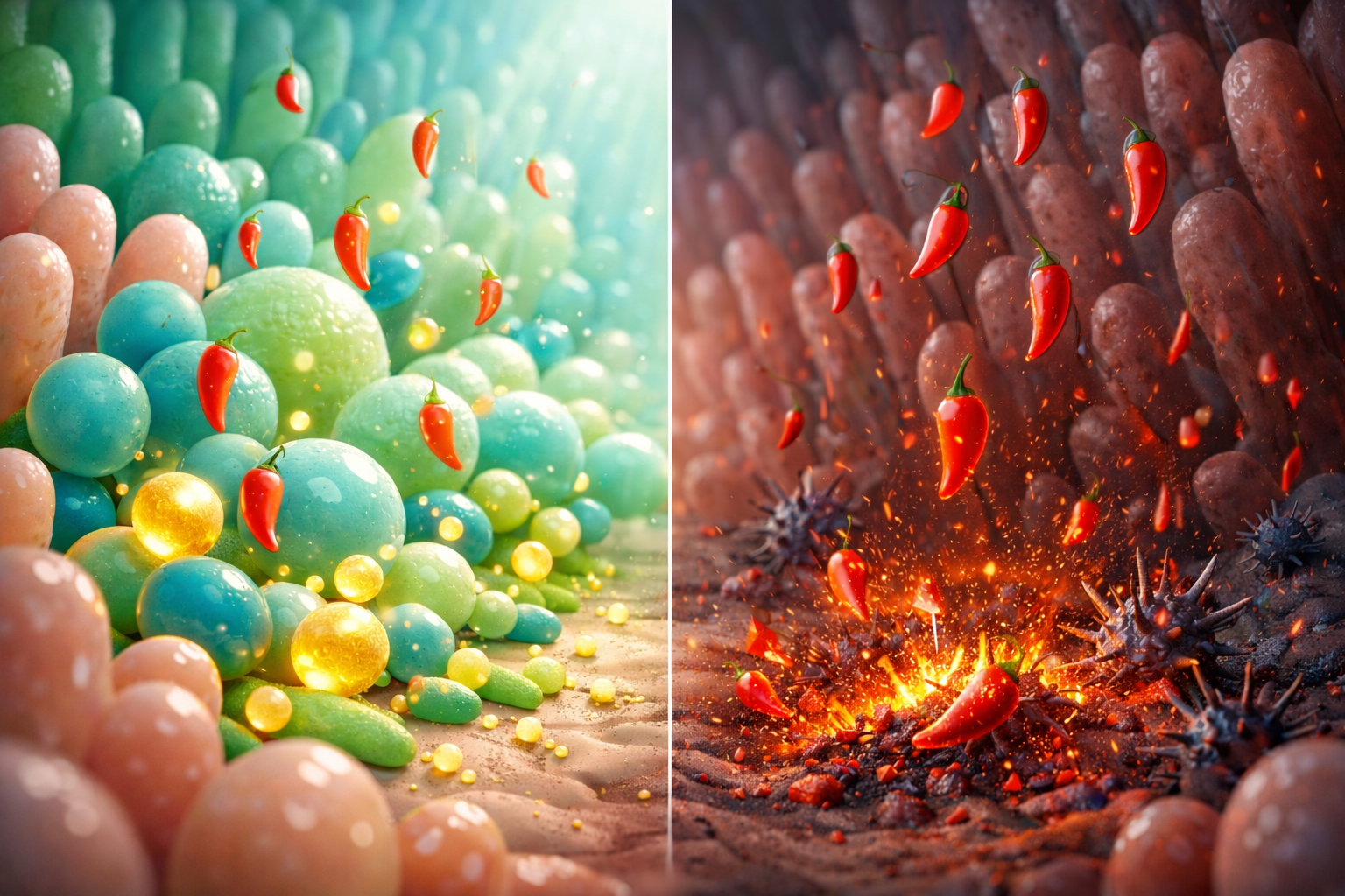 A bélrendszerünkben körülbelül 100 billió mikroorganizmus él – összesen mintegy 2 kilogrammnyi baktérium, gomba és vírus, amelyek együttesen a bélmikrobiomot alkotják. Ennek a közösségnek az összetétele meghatározza, hogyan emésztünk, hogyan működik az immunrendszerünk, és mennyire vagyunk hajlamosak a krónikus betegségekre. A kapszaicin azért került a kutatók célkeresztjébe, mert a felszívódás előtt magas koncentrációban – 500-1000 mikromól közötti szinten – van jelen a bélrendszerben, tehát közvetlen kontaktusba kerül a baktériumokkal. A kérdés az volt: ez a kontaktus árt vagy használ?A jótékony baktériumok, amelyeket a kapszaicin „táplál"